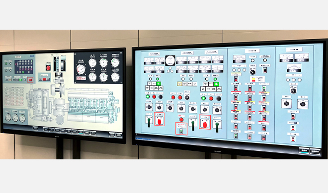 機関室と機関制御室に分かれた2つのモニターを使用。それぞれの現場で指揮者・作業者を分けられます。画面切り替えスイッチにより、機関制御室の画面を機関室の画面に切り替え可能で、機関部総員で機関室作業にあたる現場の再現ができます。